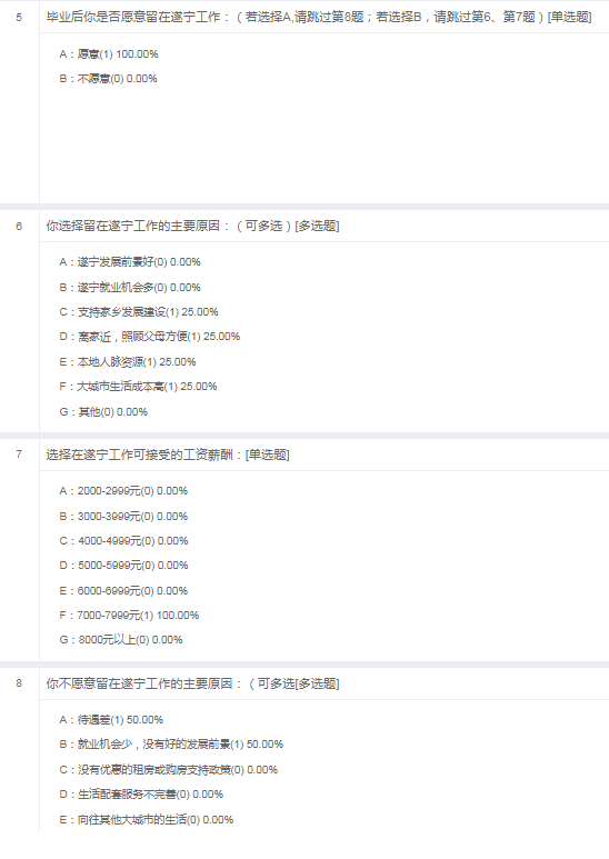 - 5、毕业后你是否愿意留在遂宁工作:(若选择A,请跳过第8题;若选择B,请跳过第6、第7题)