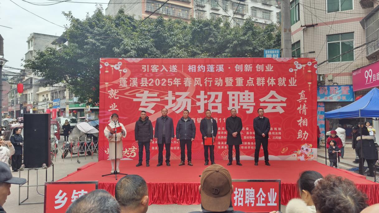 2月11日,蓬溪县2025年春风行动暨重点群体就业专场招聘会在蓬南镇举办。本次活动以“就业帮扶·真情相助”为主题,由蓬溪县人民政府主办,县人力资源和社会保障局、蓬南镇政府、县就业创业促进中心等部门承办。