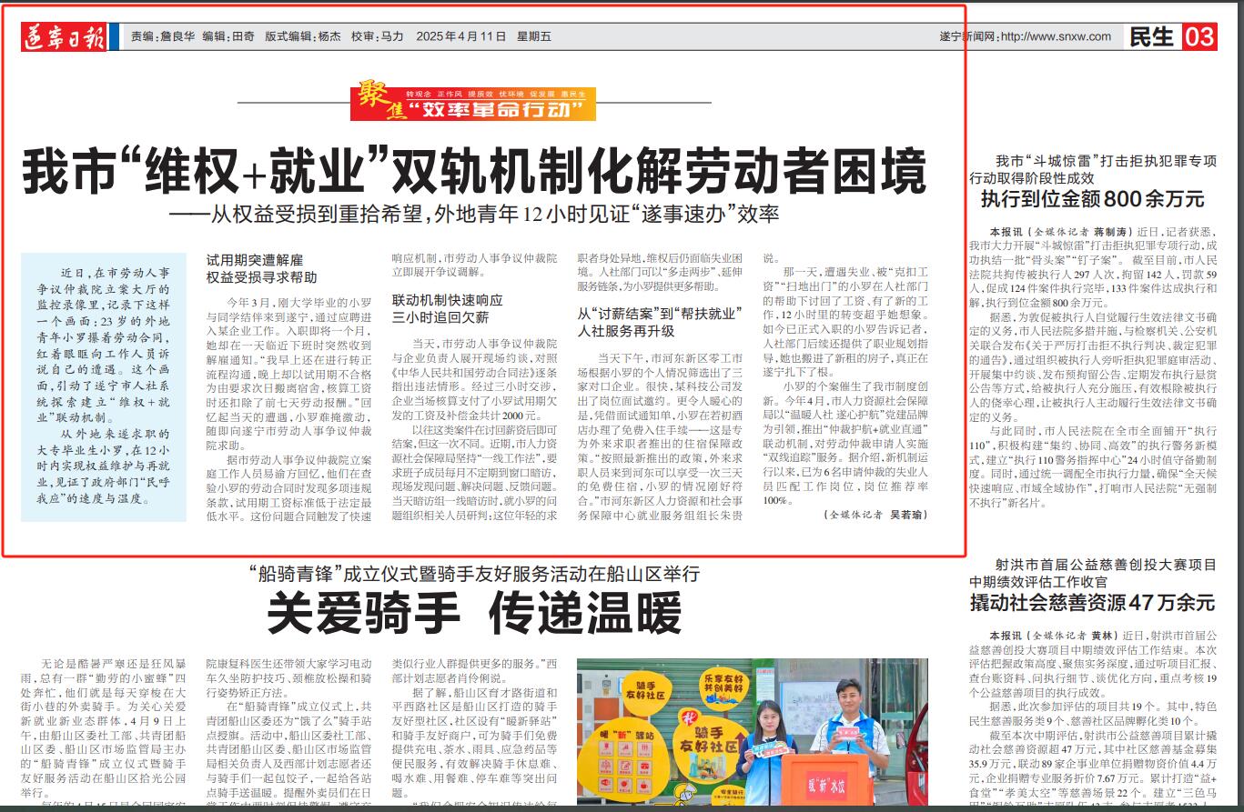 在遂宁市劳动人事争议仲裁院立案大厅的监控录像里,记录下了这样一个画面:23岁的外地青年小罗攥着劳动合同,红着眼眶向工作人员诉说遭遇。这个画面,引动了遂宁市人社系统探索建立"维权+就业"联动机制。从自贡来遂求职的大专毕业生小罗,在12小时内实现权益维护与再就业的双重保障,见证了政府部门"民呼我应"的速度与温度。