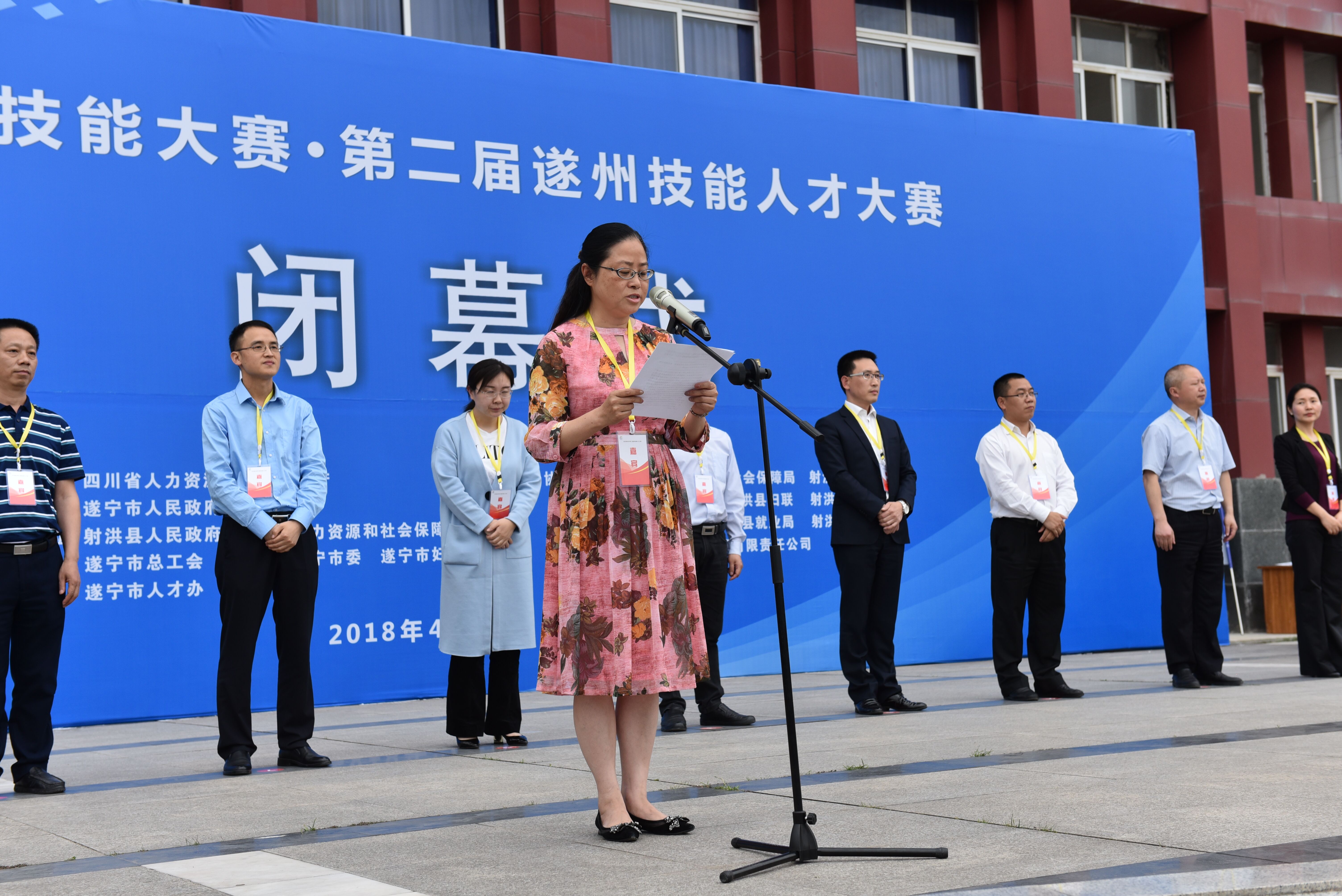 大赛闭幕式由市委组织部副部长、市人社局局长梁勤玲主持,市总工会、团市委、市妇联、市就业局和射洪县的有关领导参加了闭幕式。市政府副秘书长、办公室主任王能出席并讲话。王能同志充分肯定了遂州第二届技能人才大赛取得的成果,他对广大参赛选手在比赛中表现出来的顽强拼搏、奋勇争先的良好精神风貌和精湛职业技能给予了高度评价,并要求各县(区)政府和市级有关部门要以本次全市职业技能大赛为契机,积极营造育才、引才、聚才、用才的良好环境,充分调动各类人才积极性、主动性和创造性,进一步夯实技能人才培养平台,加强技能人才队伍建设,创新技能人才评价激励,在全市上下进一步营造出尊重技能人才,鼓励技能人才成长的良好氛围,为我市经济社会发展锻造一支宏大的“遂州工匠”队伍。