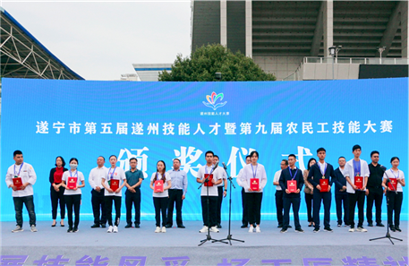 26日下午16:30,大赛闭幕式在船山区体育馆举行。闭幕式由市人力资源社会保障局副局长郭正辉主持,市委组织部副部长吴红彬出席并讲话,市政府副秘书长胡健、市直相关部门负责人、经开区党工委及人社部门负责人出席。闭幕式上,宣布了获奖选手名单并进行了现场颁奖,经开区向大英县移交了大赛赛旗。60名选手分获此次大赛10个项目的一、二、三等奖;蓬溪县、船山区、经开区、射洪市代表队因成绩突出荣获“优秀组织奖”;其他县(市、区)、园区对大赛高度重视、积极参与,被大赛组委会授予“精神文明奖”。