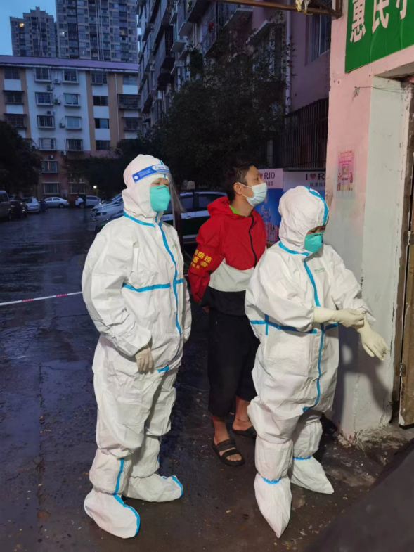 在高风险封控小区内,副支队长蒋伟平身着防护服的身影出现在小区的各个区域。入户核酸,配送物资,环境消杀,封控巡查,每天的工作扎实而有序的开展着。爬楼15层,上门核酸检测30户,日均2万步的记录是他防疫日常的打卡记录。