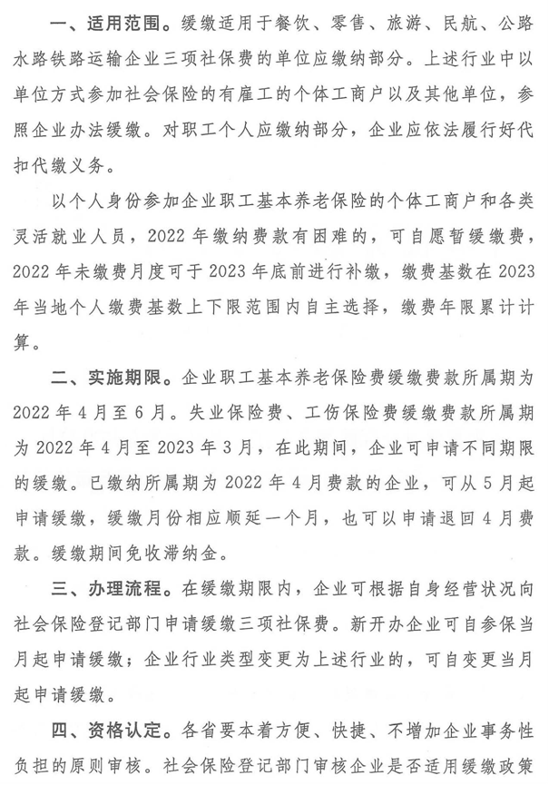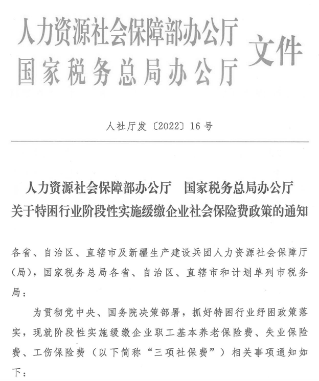 人力资源社会保障部办公厅、国家税务总局办公厅联合印发《关于特困行业阶段性实施缓缴企业社会保险费政策的通知》(人社厅发〔2022〕16号),现转发给你们,并提出以下意见,请一并贯彻落实。