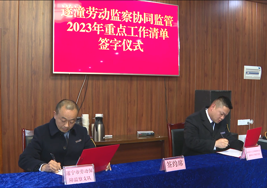 为有序推进遂潼人社一体化合作,提升两地劳动保障监察执法能力,3月28日,遂潼两地劳动保障监察机构聚焦工程建设领域欠薪治理,在遂宁市农村路网D8项目部开展执法能力提升“季度拉练”活动,双方交流劳动保障监察工作经验,并依据《遂潼合作跨区域劳动保障监察协同监管机制》,签订了2023年度劳动保障监察协同任务清单,决定以规范异地维护程序、互通共享惩戒信息、开展专项执法检查、交流重大疑难案件为重点,采取集中授课、现场观摩、实地拉练、经验交流等形式,整体推进遂潼两地2023年度劳动保障监察工作。