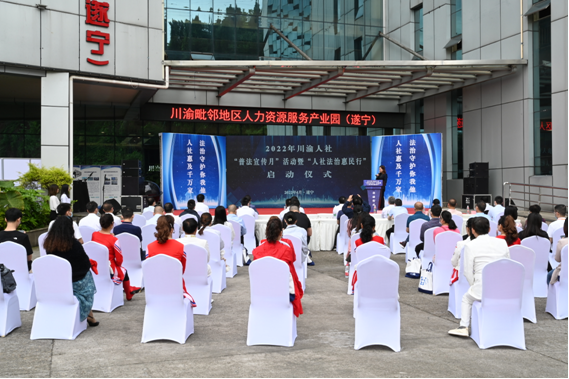 4月29日,四川省人力资源和社会保障厅联合遂宁市人力资源和社会保障局举办的2022年川渝人社“普法宣传月”活动暨“人社法治惠民行”启动仪式在川渝毗邻地区人力资源服务产业园(遂宁)举行。本次活动以“守护你我他 惠及千万家”为主题,川渝人社在遂宁、巴南两地“云端”相聚、同步举办。