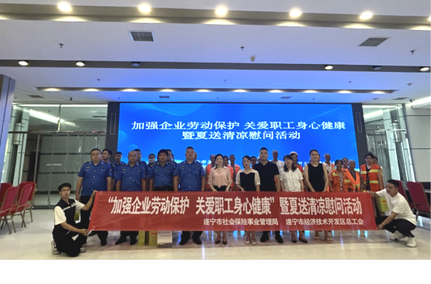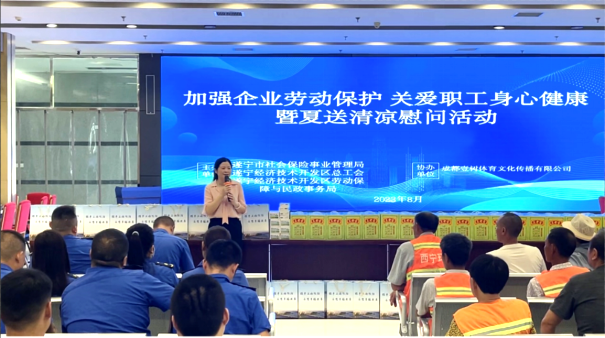 高温来袭,酷暑难耐。为切实构建和谐劳动关系,促进实现体面劳动,维护职工合法权益。8月17日上午,遂宁市社会保险事业管理局携手经开区总工会、经开区劳动保障与民政事务局开展了“加强企业劳动保护 关爱职工身心健康”工伤预防宣传培训暨夏送清凉慰问活动。