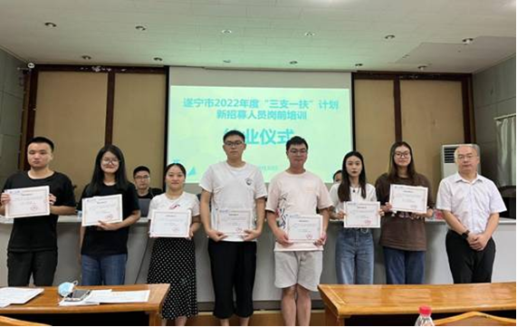 近日,为期5天的全市2022年“三支一扶”人员能力提升培训班在遂宁开放大学直属教学点圆满结业。市人力资源社会保障局党组成员、副局长程康出席结业仪式并讲话。遂宁开放大学直属教学点副校长李洪春致辞。我市在岗服务和新招募的72名“三支一扶”志愿者参加结业仪式。